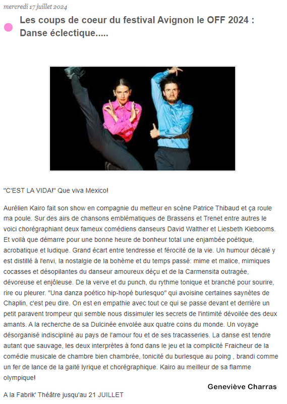 Aux rythmes ensoleillés de chansons françaises et espagnoles, ce duo de danse célèbre, avec humour, les instants inoubliables de la vida ! Une histoire poétique, où la danse, le rire et les émotions s’entrelacent avec le Hip-Hop et les arts du mime et du geste. Suite à leur création « Petite Fleur » présentée en 2017 lors du IN du Festival International Mimos, les artistes auteurs Patrice Thibaud et Aurélien Kairo se réunissent à nouveau dans leurs domaines de prédilection : la danse, l’humour et l’amour !